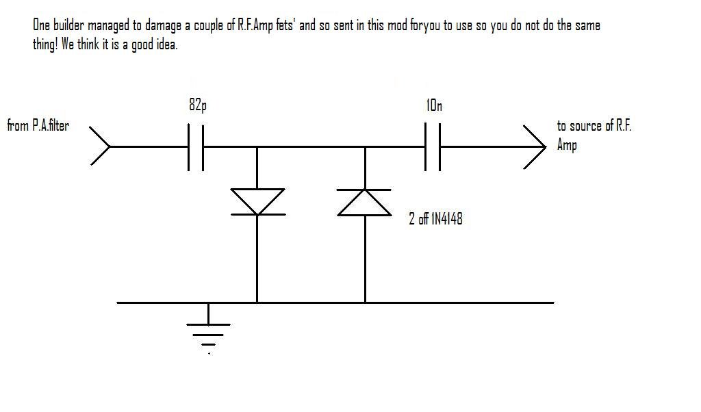 For builders of the TT Rob, PA3EQB sent in this construction tip. The problem He suffered damage to the grounded gate R.F. amplifier. The fix he applied was.... The two diodes will limit any R.F. voltages to their conducting threshold so preventing any large R.F. Votages from damaging the FET source. After the 82pF input capacitor he connected two diodes back to back (anti-parallel) to earth and then a 10n to the source.