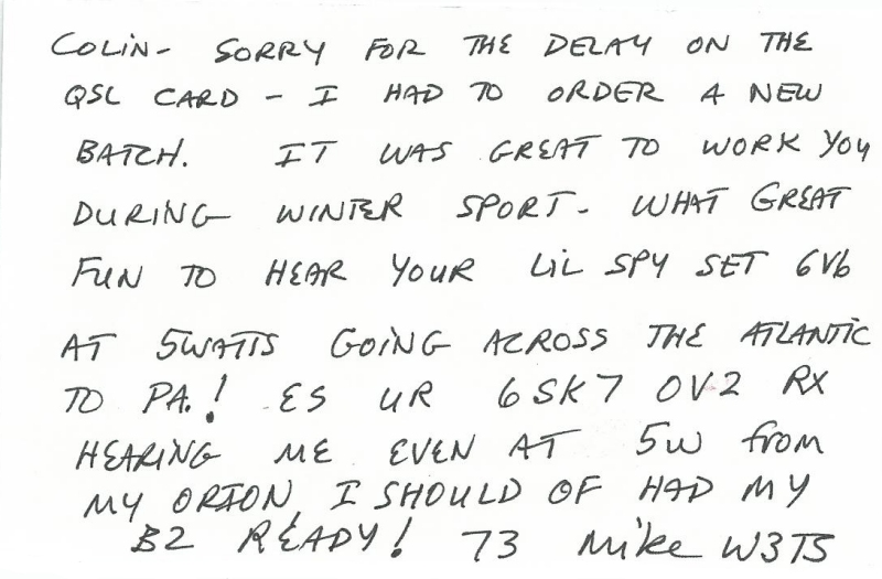 Allen where I achieved solid copy from him at power levels of 5 watts then