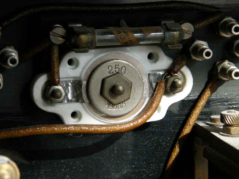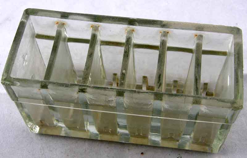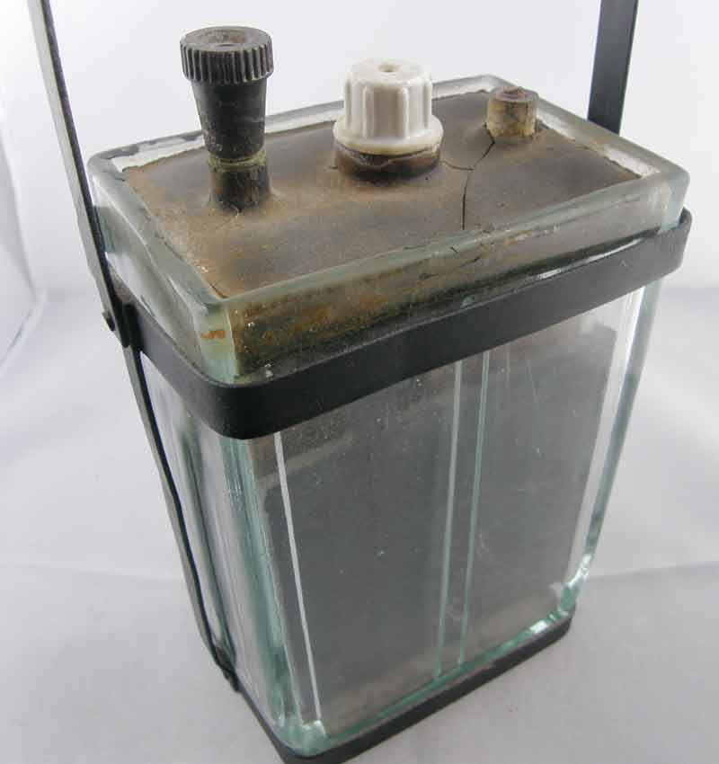 Här ett tomt anodbatteri. Böjda blyplattor mellan de olika kamrarna. Sex celler så 12V från denna tingest.