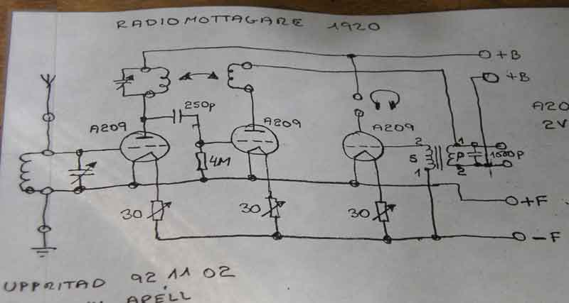 Ritade upp schemat när jag köpte den, och den fungerar. Alla rör A209. 2V glöd och 20....150V anodspänning.