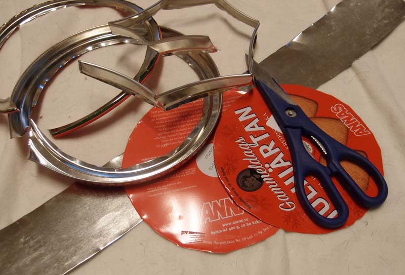 Från elmotorprojektet blev det några bitar kvar av plåten som passade till detta projekt. En pepparkaksburk sönderklippt med en kraftigare kökssax.