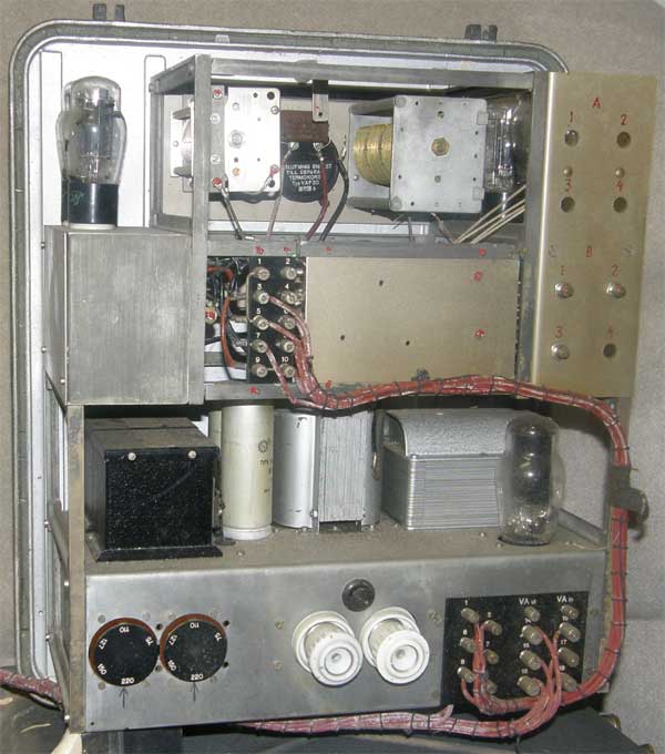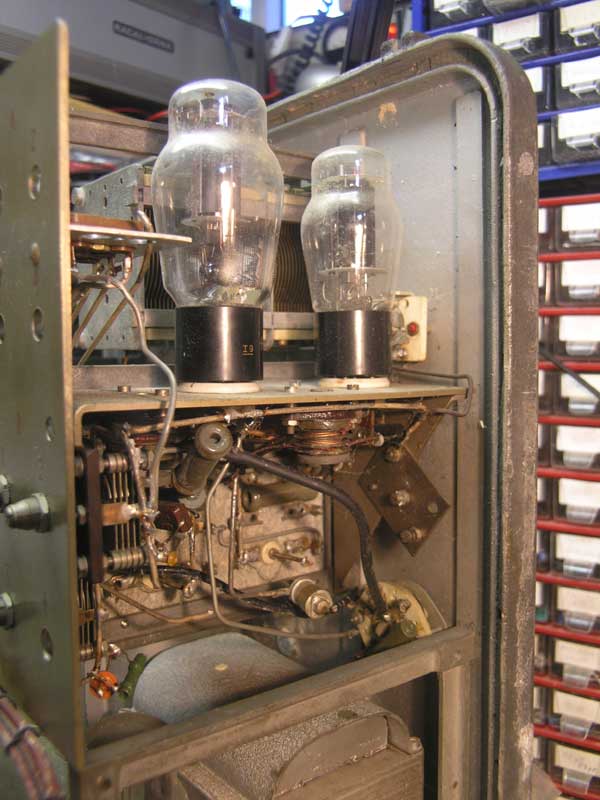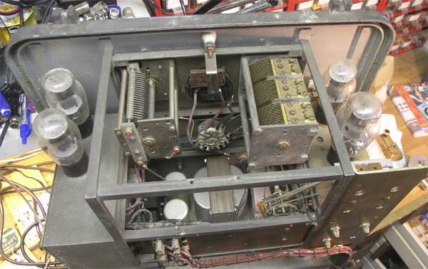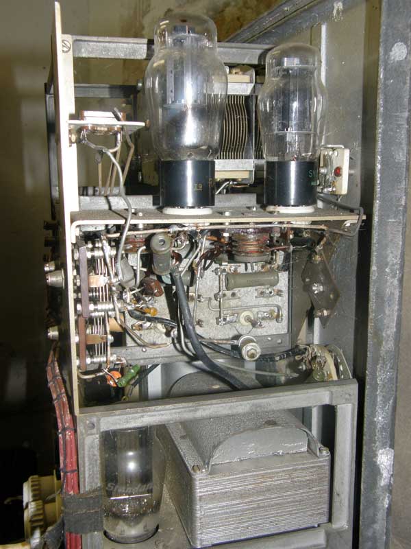 Sändaren har fem rör, 4 stycken 6L6 och ett likriktarrör 5Z4. Nätdelen är längst ner, modulatorn ovanför till vänster och sändaren upp till höger.