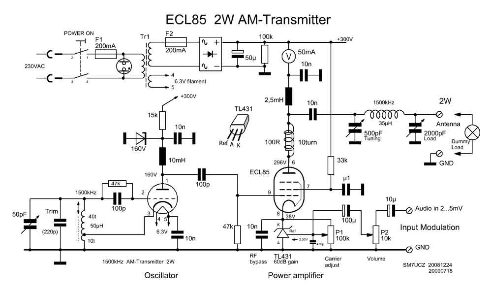 ECL85 röret är ganska kraftigt och kan lämna 10...15W ut i antennen med direktjordad katod och 350V på plåten. Men för att få 100% utstyrning med modulation i katoden så blir uteffekten inte mer än 1...3W.