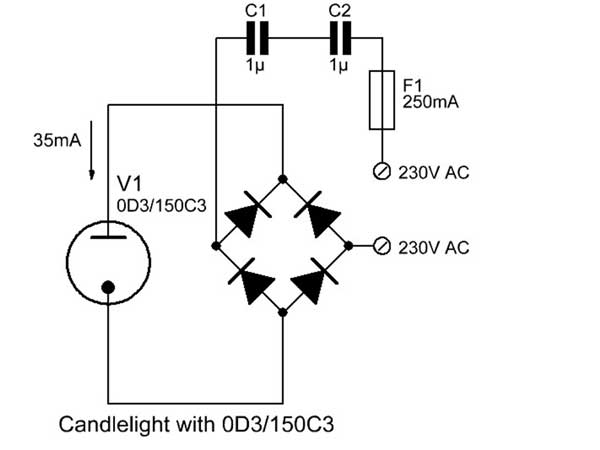 Om vi istället reducerar strömmen via en kondensator så får vi "wattlös" effekt i kondensatorn. Strömmen och spänningen ligger inte i fas, därför utvecklas det ingen värme. Därefter likriktas strömmen till stabbröret. Med 2 stycken 1uF kondensatorer i serie blev strömmen ca 35mA. Röret arbetar mellan 5 ...... 40mA. Ju mer ström, ju mer lyser röret.