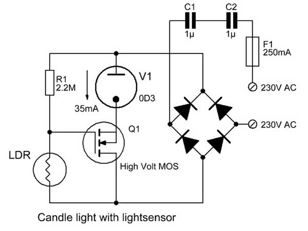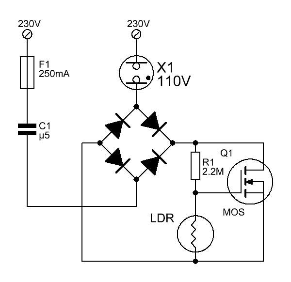 Glimlampan vill gärna ha växelström över sig, men transistorn gillar hellre likström .... Så strömmen genom transistorn likriktas i bryggan. Transistorn och fotomotståndet sköter tändning och släckning. Om det inte går någon ström genom transistorn så kan det inte gå någon ström genom glimlampan heller.