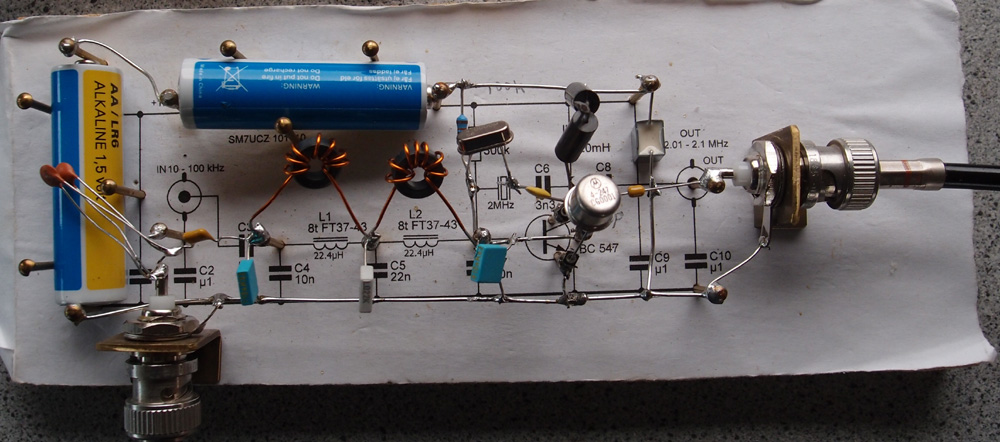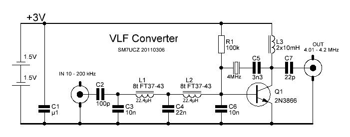 Med hjälp av en converter och den aktiva antennen går det att lyssna på Grimeton's 17,2 kHz som sänder vid några tillfällen per år. Det finns inte många mottagare som klarar så låg frekvens. Men med hjälp av konvertern omvandlas 17,2kHz till 4017,2kHz med den 4MHz kristall som är monterad. Valet av kristall kan vara vilken kristall som finns tillhanda. Avläsningen blir enklare om 1, 2, 3, ...MHz monteras. Men kretsen fungerar självklart med kristallen 3577kHz , som finns i mängder som surplus. Avläsningen blir då 3577 + 17,2 = 3594,2kHz