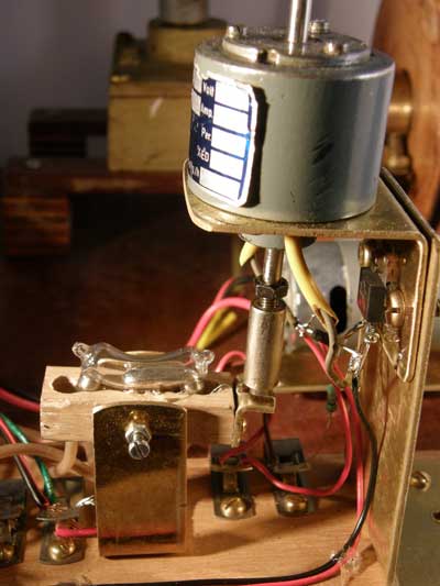 Eftersom leksaksmotorn måste polvändas för att vända riktning fick jag ta till knepet med mittuttag på batteriet. För att skydda morrhåren mot för hög ström kopplades en MOS transistor mellan kompassen och solenoiden. Solenoiden fick jag ställa upp så Newton hjälper till med returslaget. Den ojämna remskivan på kompassen är sedan originalinstallationen på fiskebåten (hemgjord)! En liten video (11mb) hur den funkar med hjälp av en leksaksmotor.....