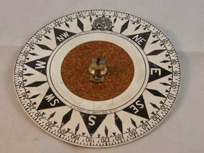 Trådgenomföring i glaset till roterbar överföring i botten på höljet. Eftersom det var dålig kontakt någonstans inne i kompassen så beslöt jag mig för att öppna den. Jag har alltid hört att kompasser har varit utsatta för törstiga skeppsmän som druckit upp spriten. Här har festen redan varit över! Denna var fylld med fotogen! Lite försiktig putsning av alla kontaktytor så fungerade den igen.