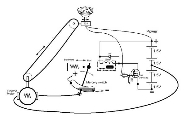Men hur...vet manicken åt vilket håll det skall styras när det bara finns en slutning? Kompasshuset är drivet i rotation av en kedja från elmotorn. Kompassnålen förväntas stå riktad mot norr. När strömmen påkopplas och morrhåren i kompassen inte har kontakt med kompassnålen så startar elmotorn att vrida kompasshuset mot babord (rodret mot styrbord). Så fort som kontakt inträffar med kompassnålen så vänder motorn riktning och vrider kompasshuset mot styrbord (rodret mot babord) tills morrhåren släpper, då vänder motorn tillbaka igen. På detta sätt kör motorn fram och tillbaka för att hålla sig i så nära kontakt som möjligt med kompassens riktning. Om nu den mekaniska kopplingen mellan motor och ratten aktiveras, så kommer ratten och därmed rodret att vridas av motorn om kursen avviker. Kursen blir lite "slingrig" eftersom elmotorn hela tiden jobbar fram och tillbaka något för att hålla kontakt/icke kontakt mellan morrhår och kompassnålen. Med rätta mekaniska utväxlingar mellan motorn/ratten/kompasshuset så blir nogrannheten omkring 1-2 grader från önskad kurs. Utväxlingen bestämmer "förstärkningen" i systemet. För att inte bränna upp morrhåren så används ett högkänsligt relä som sen styr ett tiltande kvicksilverrelä som styr den kraftiga strömmen till elmotorn. Detta tiltrelä med flytande kvicksilver har en viss tröghet, som ger systemet lite lugnare arbetssätt. Elmotorn är på 250W. Styrsystem tillverkades med denna styrning så sent som 2002. Morrhåren är idag ersatta av Hall-element och MOS-transistorer styr motorn. Denna typ av styrning tillverkas än i dag och har modellbeteckning "Model 211"