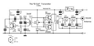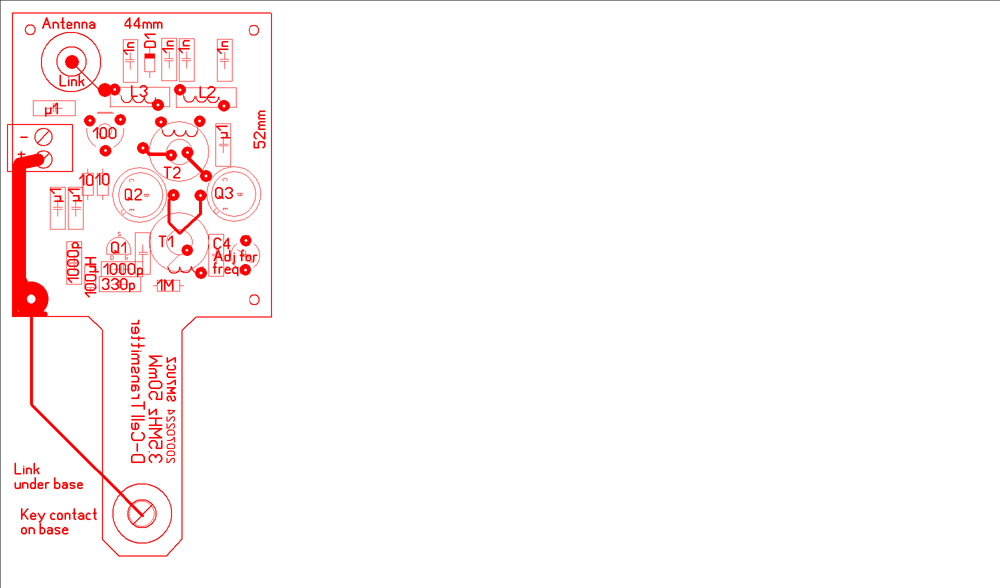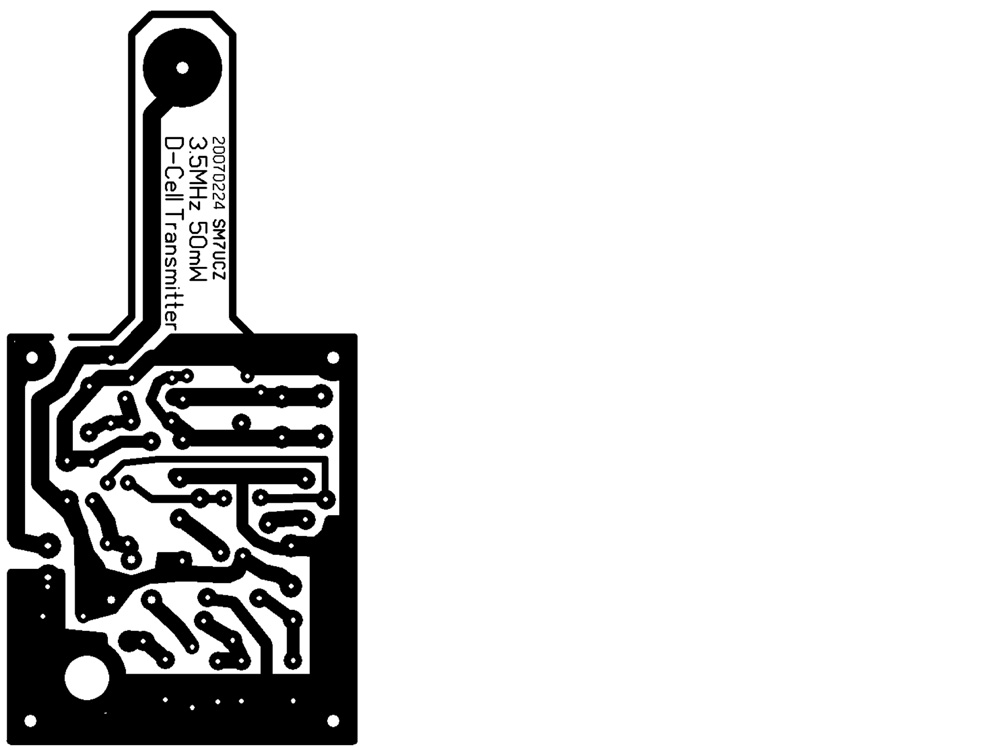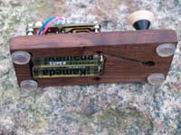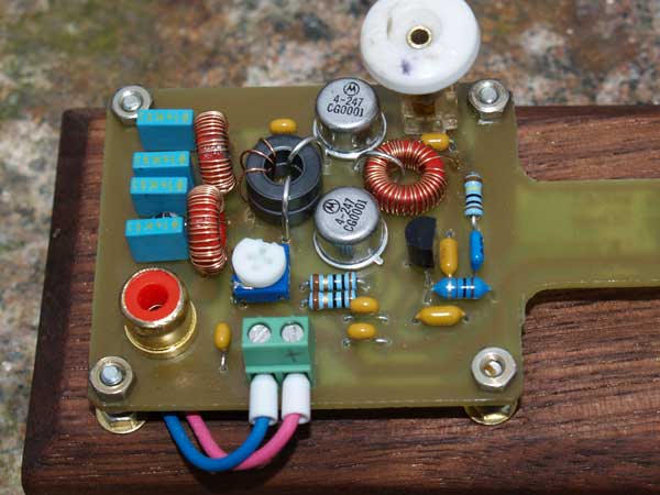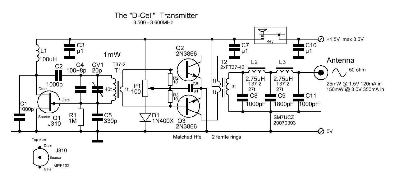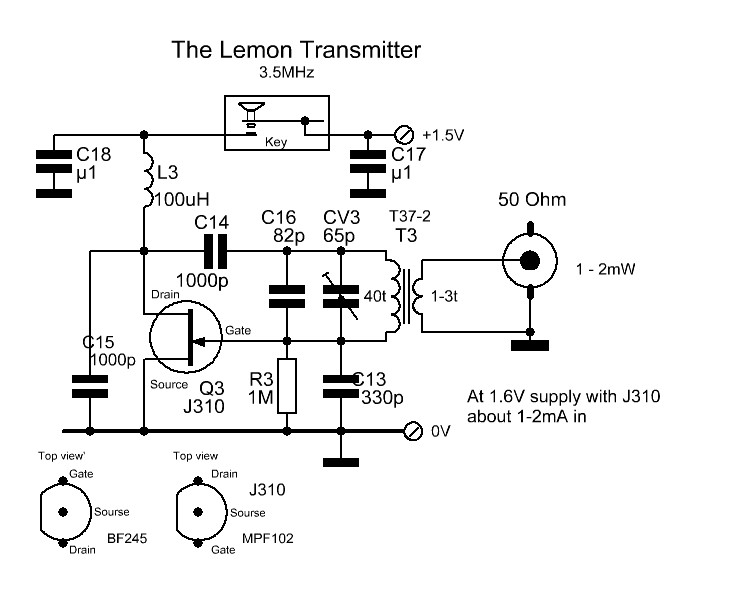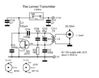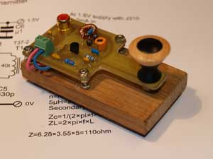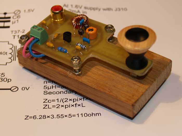 1.5V TransmitterHur kan man få för sig att experimentera med en sändare med endast 1.5V matningsspänning? Karl-Olof, SM3CLA önskade sig en sändare på 3.5MHz, och dessutom med VFO till sina experiment med citronbatterier, ångmaskiner, solceller osv.. Han använder saften från citroner som elektrolyt mellan koppar och zinkplåtar. Detta ger ca 1V med lite mA. Efter att ha provat olika kopplingar av oscillatorer, de flesta slutade att svänga strax under 3V, så fann jag en koppling i SPRAT, den engelska QRP-tidningen. Efter lite modifieringar så svängde den ner till ca 0.7V. Från GQRP-Sprat nr 92 Efter att ha testat med olika FET-transistorer så fann jag att J310 var vassast, andra fungerade också med lite lägre effekt Uteffekten är blygsam, ca 1mW i 50 ohm. Den blev hörbar tvärs över byn, men inte mer. Med 3V blev det lite högre effekt, ca 3mW. Vid ännu högre spänning så stannade den. Kolla här...Karl-Olofs bragd....130km på 1mW! . The Lemon Transmitter Nu började planerna att lägga till ett slutsteg, också drivet av 1.5V, D-Cell, batteri. Därav namnet. Vid denna låga spänning så uppför sig inte transistorerna som tänkt. Det blir låga impedanser på bas och kollektorn. Normalt är kollektorimpedansen U*U/Pout*2. (Spänningen i kvadrat genom dubbla uteffekten). Men nu blev den betydligt lägre. Det blev laborerande med olika kärnor och varv för att få upp uteffekten. Driveffekten är sändaren ovan med 1mW. Jag kunde max få ut ca 25mW med två transistorer i push-pull koppling. Transistorerna behöver vara matchade så att de driver lika, annars blir det konstiga övertoner. Steget går i klass AB, alltså lite förspänning på basen, för att hjälpa till vid den låga ineffekten. Efter testen till Agne, -FGG på andra sidan byn så blev betyget S9 +20dB, mot tidigare hörbart med 1mW. Med 3V så ökar utteffekten drastiskt till ca 150mW. Vid högre spänning storknar oscillatorn. Ragnar SM7XGF fixade träplattorna i ädelträ åt mig. Eftersom det är toroidkärnor i konstruktionen så blir den inte speciellt "handkänslig". Märkbar frekvensändring blir det först när man petar på komponeterna. The D-Cell Transmitter Sändaren på linoljat valnötsträ Sen fräste jag in plats för två batterier på undersidan, nu är riggen komplett....anslut antennen och du är QRV med 150mW Knoppen är från Biltema, knoppar till skåpsluckor, 6st för 40:- VFO-ratten är från Karl-Olof's persiennsnören. Med infrästa batterier i bottenplattan