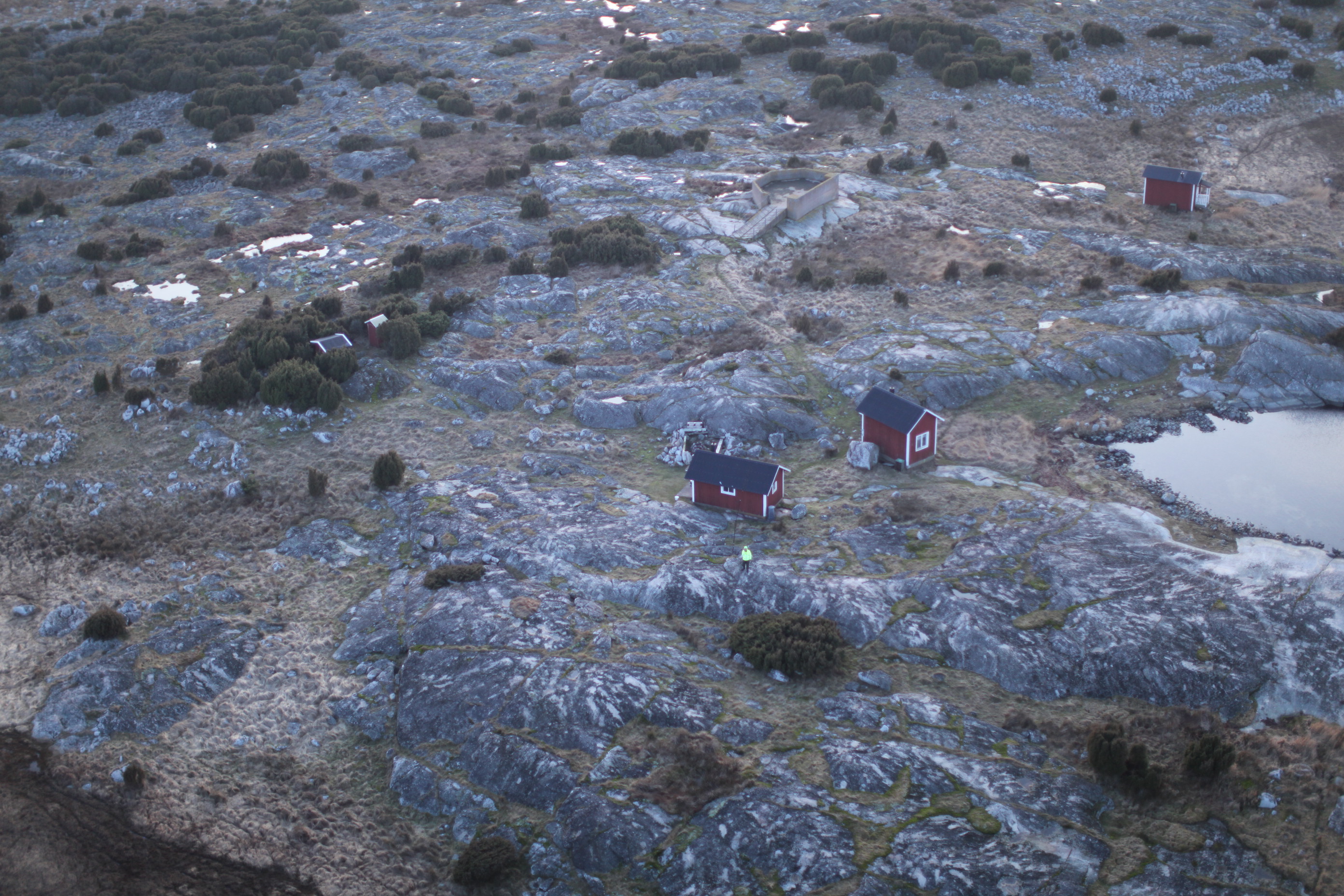 Kompisen med sitt flygtyg, var tvungen att kolla hur det gick för "enslingen på skäret". Han tog sig ut för att ta några flygbilder. Denna bild är tagen från väster med stugorna "Vikingen" närmast, "Kommendanten" och "Kröl". Till höger strålkastarerampen och utedassen i busken. I bakgrunder skymtar Inlängan. Objektet, "enslingen" står i sin gula tröja. Klicka på bilden.