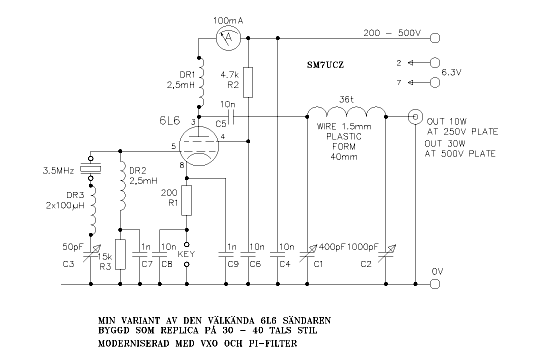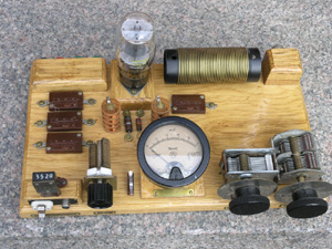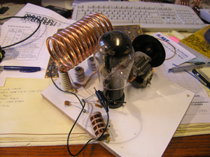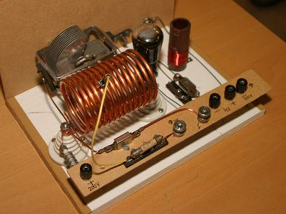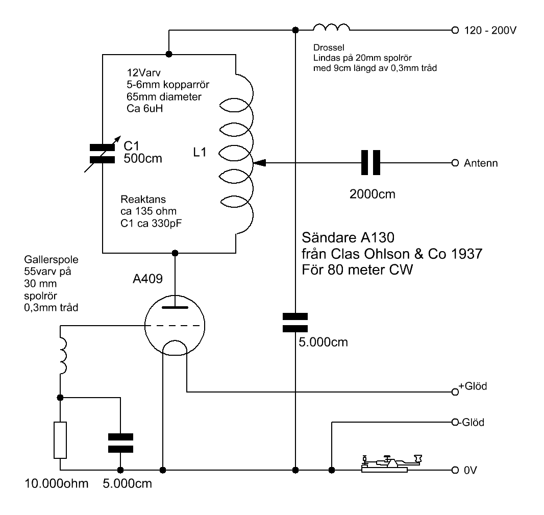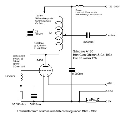 Under julhelger brukar jag ha ett projekt som har med radiorör att göra. Nu skulle jag se hur enkelt en sändare kunde byggas, med så få delar som möjligt. Spolen lindades av bromsrör. Och jag letade upp gamla komponenter i gömmorna. Röret är stort och spektakulert, ett RE604. Jag letade på webben efter data, och fann att någon ville ha 750 dollar för ett rör!! Det blev till att handha det varsamt! Kretsschemat med komponentvärden enligt 1920-talets specifikationer Provbygge av kopplingen för att kolla om den överhuvudtaget svängde med detta rör