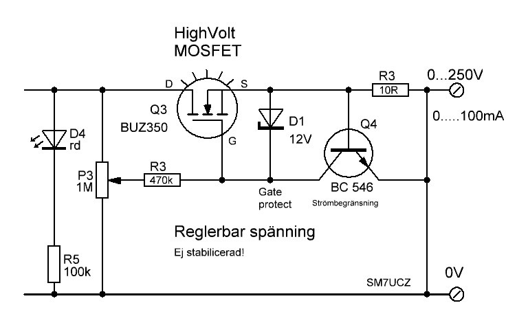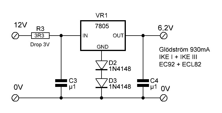 Glödströmmen fixades med en 7805. R3 bränner bort lite effekt innan stabkretsen.