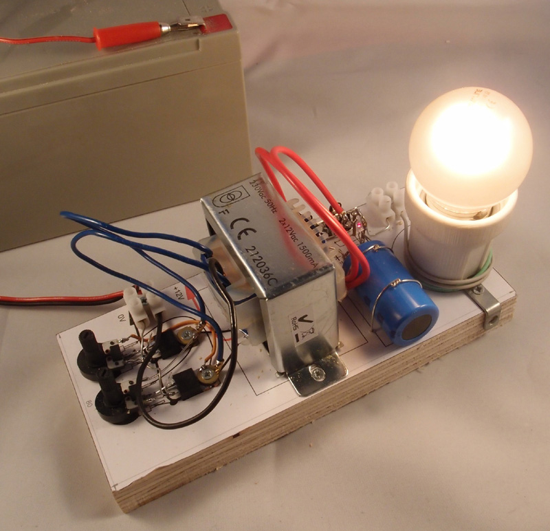Här lyser en 230V 15W lampa från 12V som testbelastning. Här är det med en 2×12V, 1500mA trafo. senare använde jag en 2×9V, 900mA trafo, den räcker gott.