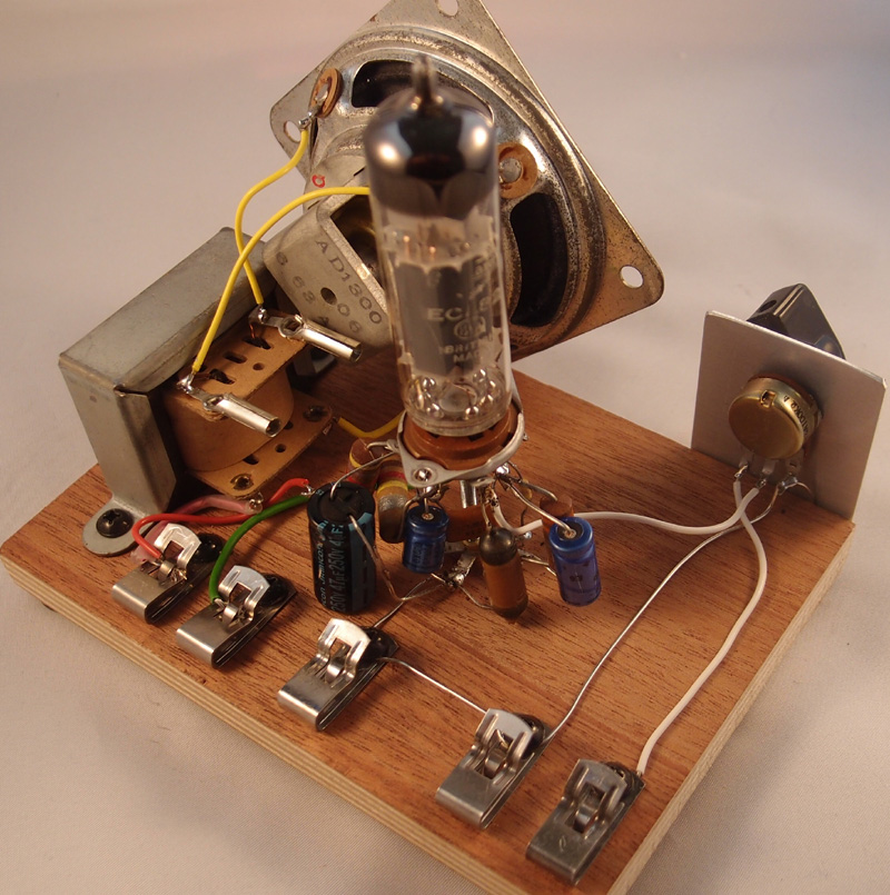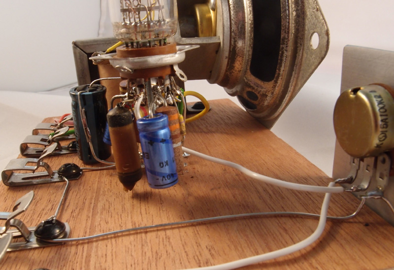 Ritade om schemat. Den ville busa och tjuta tills jag la dit en kondensator över gallerläckan till trioden och jordade ena sidan av högtalaren.