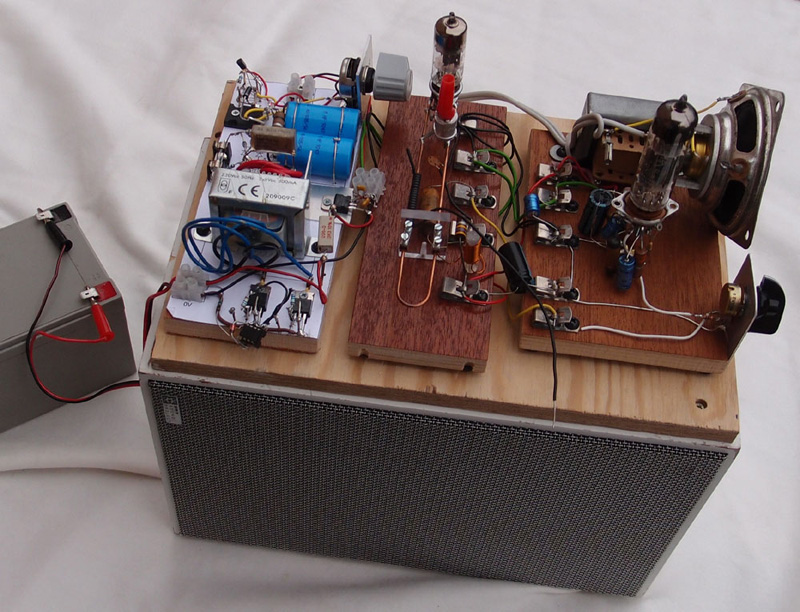 Och med alla tre plattorna monterade på en högtalarelåda går det att demonstrera hur enkla medel det behövs för att ta emot på FM-bandet och driva rörgrejerna från ett 12V batteri. Ljudet är helt i klass med vilken rörradio som helst. ca 300mW uteffekt. Egentligen är mottagaren en AM-mottagare. Genom att flankdetektera så går det utmärkt att lyssna på FM-bandet. |