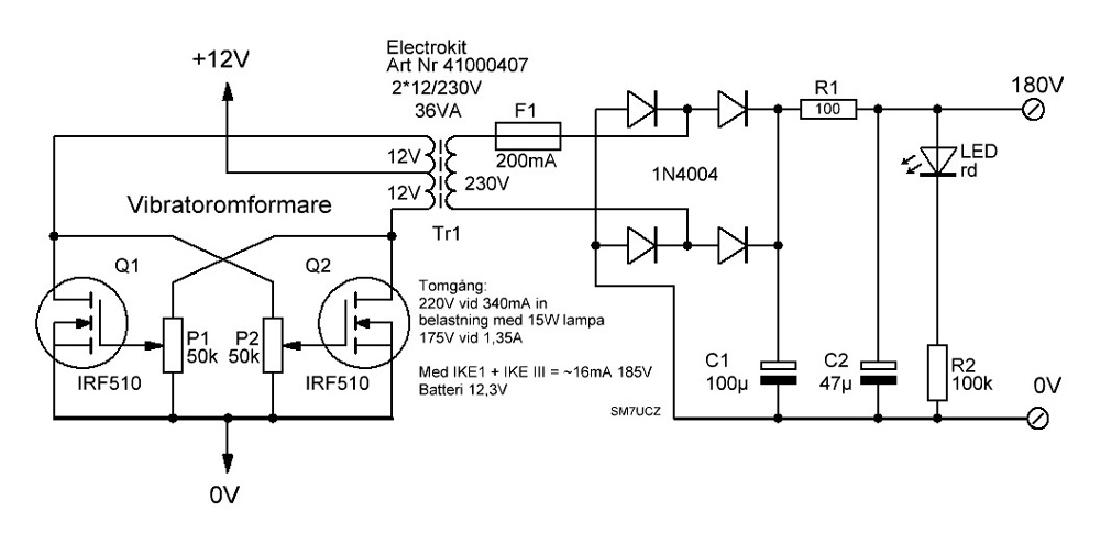 Det är enkelt att hacka upp spänningen från 12V till 200V genom att vända på en nätrafo och med hjälp av två MOS-transistorer och två trimpotentiometrar.