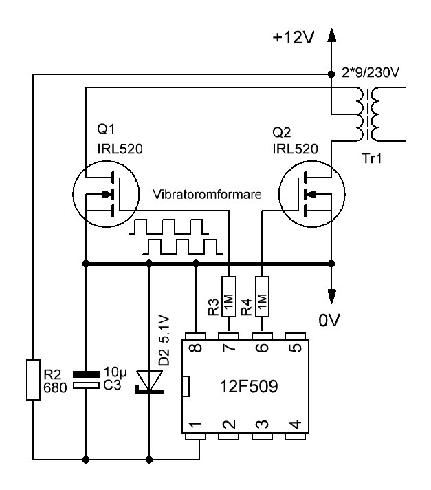 Med den enkla vibratorn med trimpotentiometrar får man gärna lite knatter i strömmen. Båda transistorerna leder samtidigt ett kort ögonblick.. Men med hjälp av en PIC-processor kan man förskjuta pulserna lite. Och med gatemotstånden (1M) går det att laborera så pulsen inte blir så fyrkantig. Här finns PIC-programmet, öppnas med en texteditor. PIC:en behöver 5V så jobbar den på de båda utgångarna.