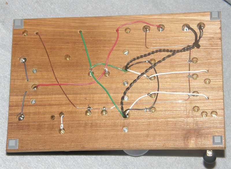 De flesta kopplingarna gjordes på undersidan. Så länge frekvenserna ligger under 7 MHz går det bra, högfrekvensmässigt är det egentligen oklokt att bygga på detta viset. Men det fungerar.
