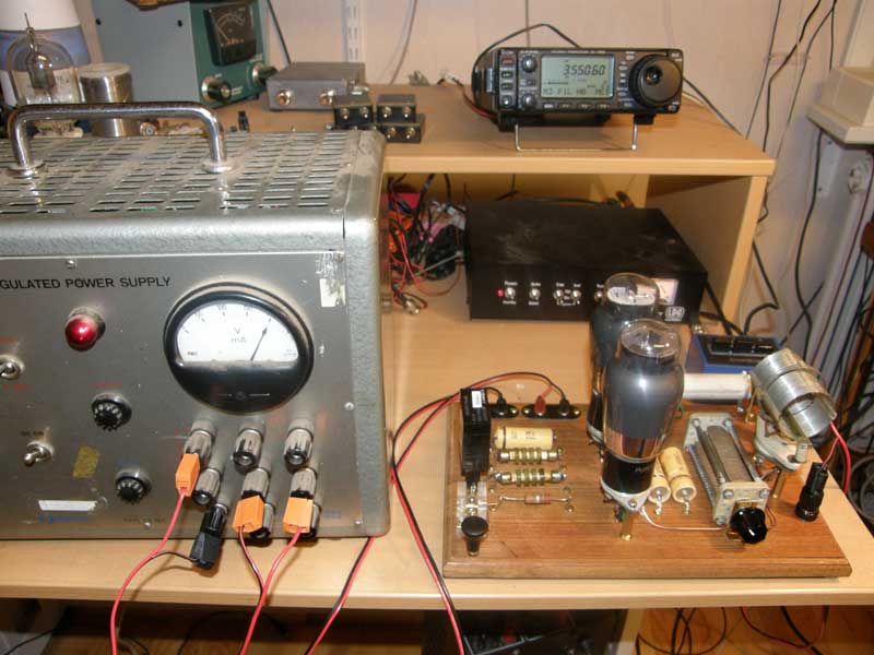 Nu ska det testas skarpt. Med hjälp av ett stabilicerat 0 - 500V nätaggregat så kopplades sändaren upp mot antennen. IC 703 användes till mottagningen, inte riktigt rumsrent...borde vara liknande rörbyggen.....