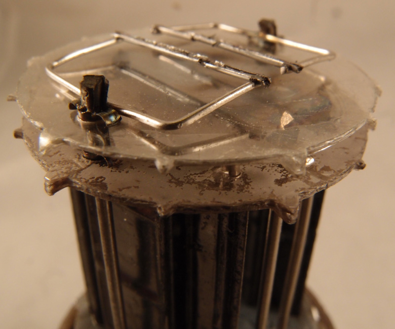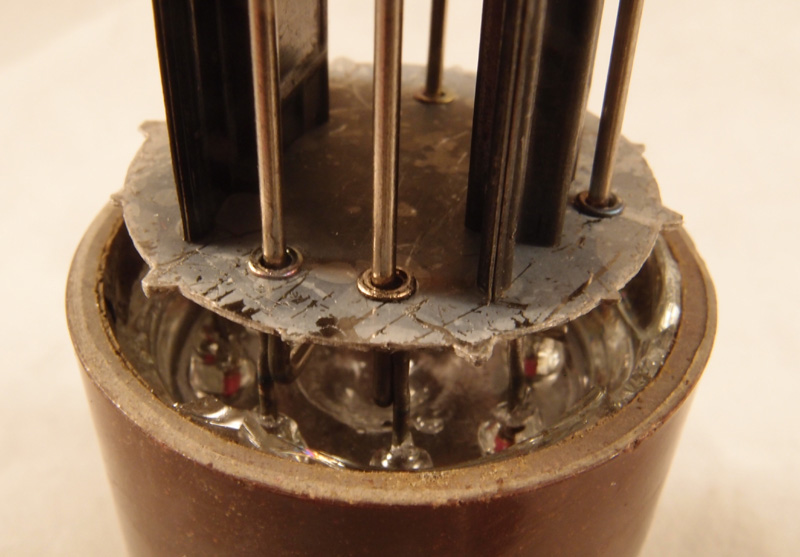 Elektrodsystemen har dubbla getter, tre tandade glimmerskivor och extra stagningar håller hela konstruktionen på plats, inne i glaskolven. Det här röret hade glödavbrott. Så jag knäckte glaset för att kunna visa det gedigna hantverket.
