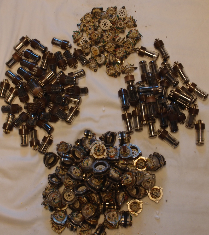 Några av delarna i en kanonstyrningutrustning nerplockat av en pojk på 90-talet. Detta skulle slängas....vilket jag inte kunde se...och nu har det legat på min vind i karantän under 20 år! Skulle röja lite, men slog av nyfikenhet på nätet, ena rörets beteckning, 33S29B och fann att det kostade $200:- Styck! Ett annat, 33S30B, $800:- Styck! Oanvända i originalkartong naturligtvis. Audiofilerna avgudar dessa rör. Rören är konstruerade av Standard Radio som extra skakstarka för att passa i miljöer runt kanoner. Och tillverkades under hela 1950-talet. Fabriken lades ner 1960. Rören på bilden är begagnade och utan kartong, men eftersom Sverige inte har varit i krig de senaste 200 åren, så är de lindrigt slitna... Socklarna, fortfarande med avklippta trådar. Men av en sort som inte går att uppbringa idag... förrän nu. Typbeteckningen 33S29B?? 3=triod, 3=triod, S = Standard Radio och 29 = löpnummret, typbeteckningen B=utvecklingsversionen