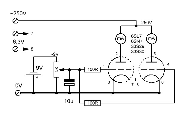 215V på anoden, -10V på gallret, ger ca 43mA anodström.
