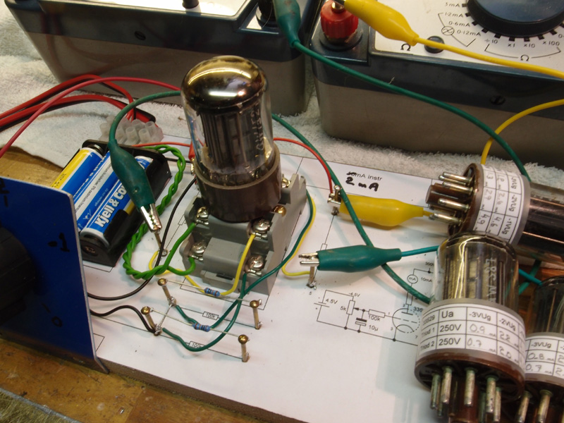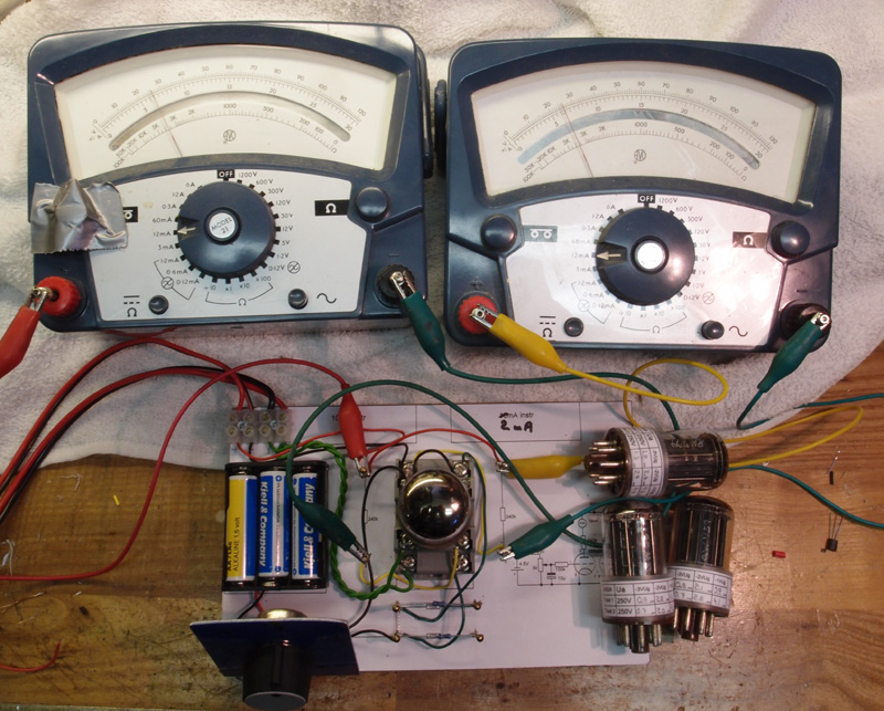 Uppmätning av rörenFör att kunna testa båda rörhalvorna samtidigt kopplade jag upp två AVO-metrar och batterier till gallerspänningen.