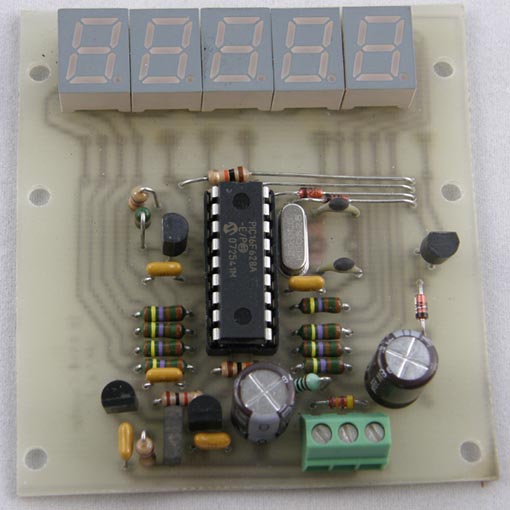 FrekvensräknareDL4YHF har gjort en suverän konstruktion till en frekvensräknare Kretsschema på en frekvensräknare som DL4YHF har konstruerat och programmerat. 0-50MHz. Enklare kan inte en frekvensräknare bli?? Den är lite ljussvag. Varje pinne på PIC:en orkar endast driva 25mA. Pinnarna 1,2,17 och 18 är gemensam på varje display där alla segmentens strömmar skall passera. Siffrorna scannas, endast en siffra är tänd åt gången, men i snabb följd naturligtvis, för att ögat inte skall uppfatta det som flimmer. Kretskortet med räknaren från 0 - 50MHz |