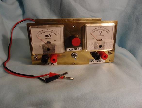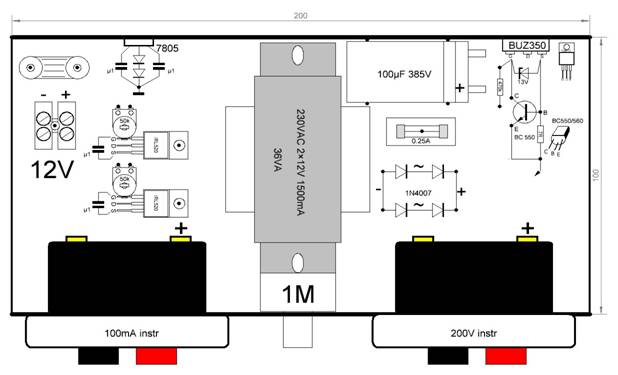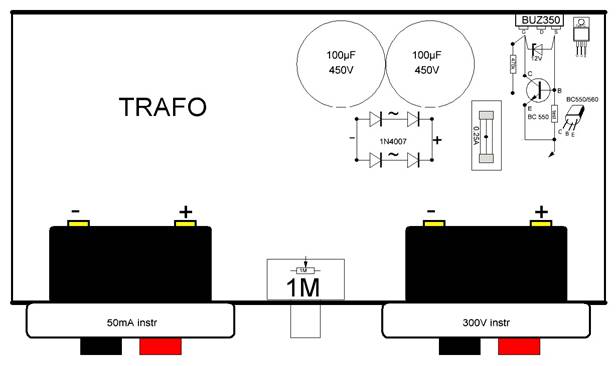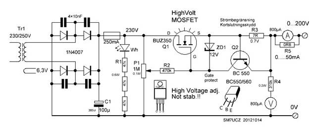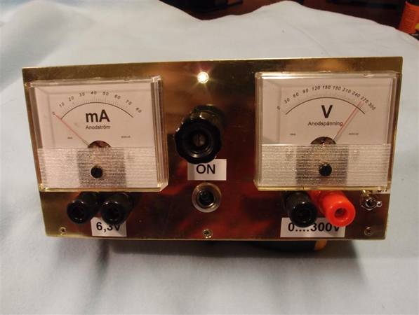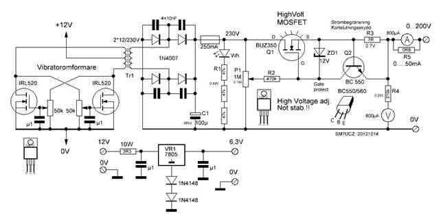 Till våra laborationer behövs 100...300V anodspänning och ca 10W effekt. Alla har inte tillgång till ett nätaggregat för denna spänning Men... klubben har tillgång till de flesta komponenter, för att intresserade skall kunna bygga sig ett eget aggregat. Det inte klubben har, är transformatorn. Vi har två möjligheter att kraftförsörja, 12VDC eller 230VAC från nätet. Det är fritt val från byggherren. I princip är det transformatorn som bestämmer utspänningen och effekten. Det behövs ca 200...300V och 50mA till våra laborationer.