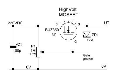 Vid laborationer med våra rör, så är det smutt att kunna variera spänningen. Med en potentiometer, P1 och en MOS-transistor så är det enkelt att lösa detta. Zenerdioden på 12V skyddar mostransistorns gate, att aldrig överstiga 12V. Vid ca 16V så förstörs transistorn. Funktionen är följande: Potentiometern delar ner vår spänning från C1 och matar in på Q1:s gate. När spänningen mellan Source och Gate är ca 4V så öppnar transistorn. Så spänningen på S är ca 4V lägre än på Gaten. Men de följs åt när vi vrider på potentiometern. Här har vi vårt reglerade aggregat. Men märk väl att det är inte stabiliserad spänning. Spänningen varierar någon volt vid olika belastningar, eftersom spänningen över C1/P1 sjunker vid belastning. Mellan Drain och Sourse på transistorn ligger det en spänning som är beroende av inställningen på potentiometern. Transistorn funger i princip som ett reglerbart effektmotstånd. Spänningen och strömmen genom transistorn kan man genom ohms lag konstatera att det blir varmt!! Transistorn Q1 måste monteras på kylande underlag. Det är också lämpligt att montera transistorn isolerande från underlaget. Drain är elektriskt förbunden med monteringshålet på transistorn!