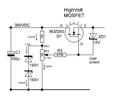 Bättre spänningsregleringI det nätdrivna aggregatet så blev råspänningen över 360V. Det ger möjligheten att stabilisera spänningen över potentiometern P1 till 300V, vilket blir maxspänningen som aggregatet kan ge. Jag hade 150V zenerdioder, två i serie ger 300V och fördelar värmeförlusterna på ca 1,2W. Detta ger lite bättre spänningstabilisering och fungerar tills belastningen sänker råspänningen över C1 till under 300V, sen dippar utspänningen också. Detta är en snikvariant, riktig stabilisering har återföring från utgångsklämmorna som då tar hänsyn till spänningsfallet genom Q1. Det kräver betydligt mer komponenter.