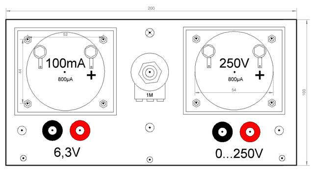 I prototypen var det instrumenten som bestämde storleken på fronten. Panelen är av 1,5mm mässing. Skrotbitar från vattenskärning. Det som är besvärligt med fronten är de två 54 mm instrumenthålen. Men, Christer plunchar dessa på sitt jobb. Övriga hål får var och en borra. Denna skiss är ett förslag, var och en är fri att bestämma vilka brytare och uttag som önskas, och var de skall placeras.