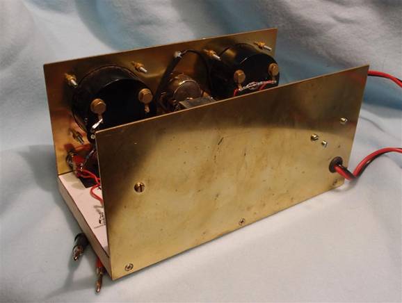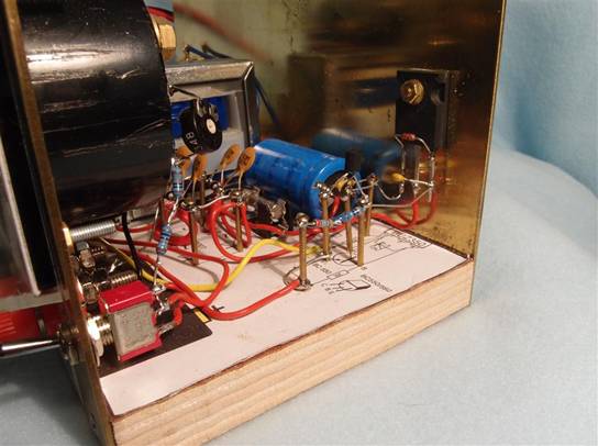 Och inom KRAS har vi anammat träplattor som chassi för våra byggen. Även detta aggregat är byggt på en 200 × 100 mm träplatta och mässingsspikar. De komponenter jag hade i junkboxen, ritades upp i skala 1:1 och pusslades fram och tillbaka för att få plats på plattan. Detta är vibratorvarianten. Flera har slagit ner mässingspikarna för långt. De sticker fram på undersidan! Då är det inte bekvämt att ha handen där. Det sticks... och värre, 300V på några spikspetsar ger obehagliga överraskningar.