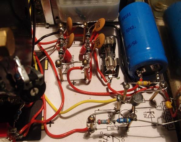 Efter transformatorn sitter fyra vanliga kiseldioder som med C1 tillverkar vår råa likström. Här kan vi ytterligare filtrera strömmen med drossel och en kondensator till. Kondensatorerna över dioderna dämpar spänningsspikar när dioden stänger. Normalt har vi ett bleedermotstånd som belastar trafon och laddar ur C1 när transformatorn kopplas ur. Både motståndet och transformatorn blir varm. Dessutom tullar motståndet nyttiga mA från de små transformatorer vi har. Så här finns endast lysdiod som indikering och laddar ur C1 med några mA. Motståndet R1 till lysdioden, är uppdelat på tre motstånd, eftersom våra små motstånd inte klarar hög spänning. Säkringen ligger efter den stora kondensatorn C1för att skydda laboranten om något händer. En 15W lampa kopplad till utgången lyser flera sekunder på energin i kondensatorn. Normalt ligger säkringen direkt efter trafon. Det går naturligtvis att ha en säkring där också.