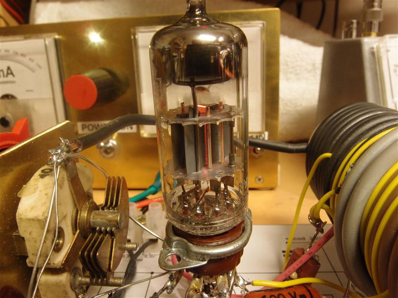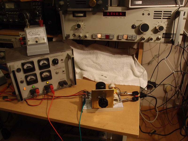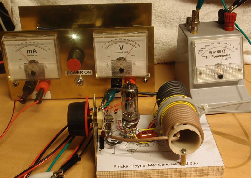 Här är det ca 0,5W ut med 180V in. Senare minskade jag motståndet / gallerläckan till 1k, Då ökade effekten till ca 4W. En avsevärd skillnad. Inom klubben bygger vi även ett anodspänningsaggregat. Det som syns upp till vänster. Effektmetern uppe till höger hittar du här.
