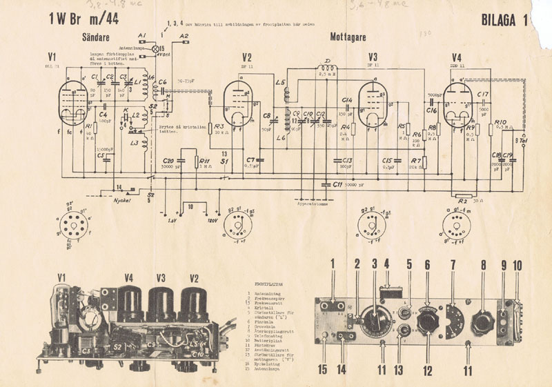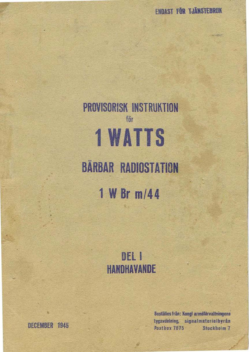 Detta är den finska jägarstationen M11X som kom att bli den svenska bärbara 1W Br m/44. Stationerna kom till Sverige genom operation Stella Polaris, eller denna länk . Stationerna är byggda i Finland, och efter operation Stella Polaris så byggdes resterande stationer i Sverige av finnarna. Det är finsk stavning på texterna som är instansade på panelerna.