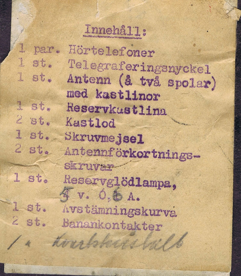 En innehållsförteckning på stencilpapper. Klistrad ovanpå den finska. Medföljande stationsbok har aldrig används...