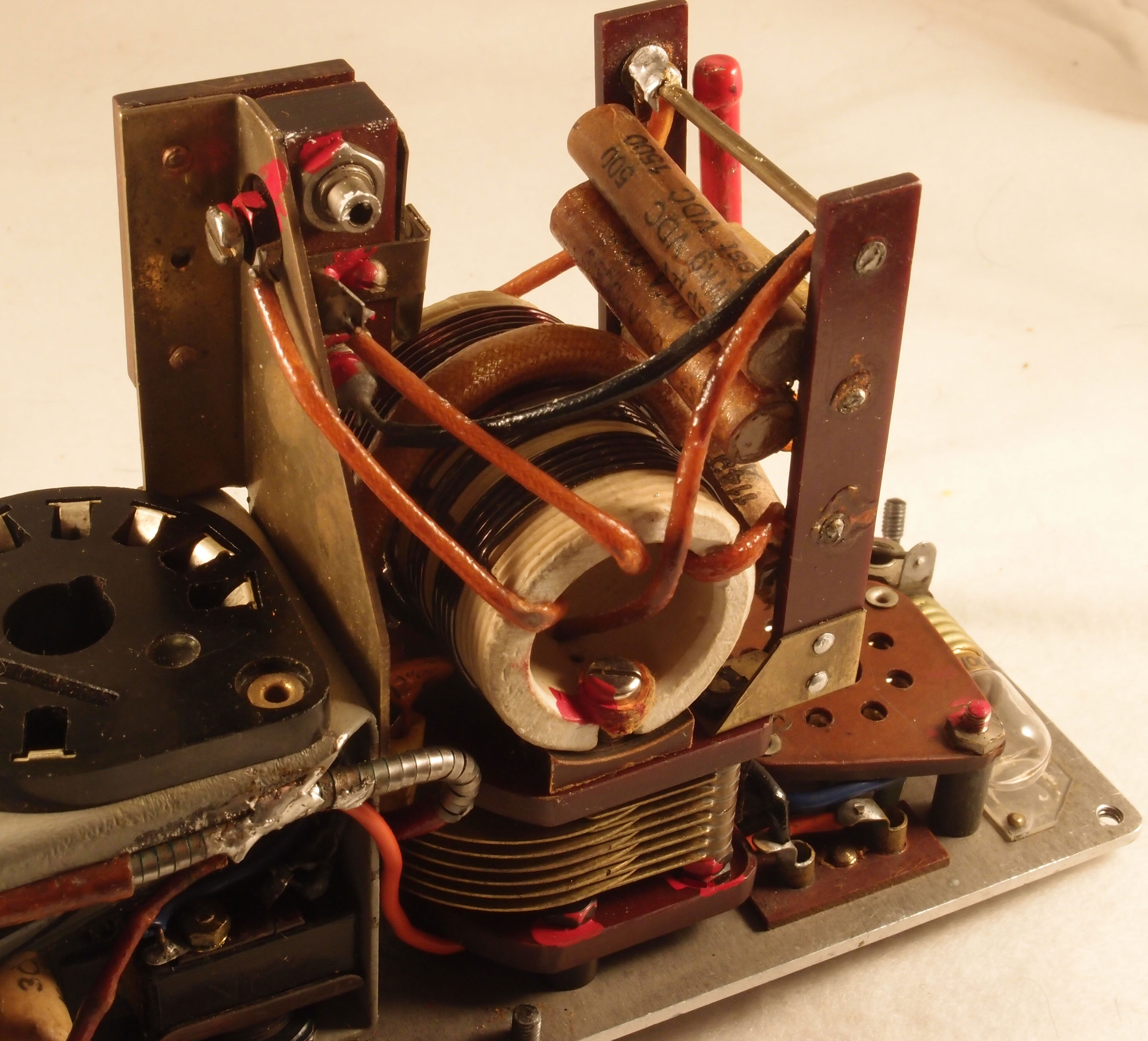 Spolen lindad på en stabil keramikstomme. Antennlinken, den svarta tråden, 1 varv.. löst lindad. Den gula tråden är galleråterkopplingen. Röret DDD11 är en dubbeltriod, där "DD" står för krafttriod. Första "D" är batterimatning på glöden, 1,5V