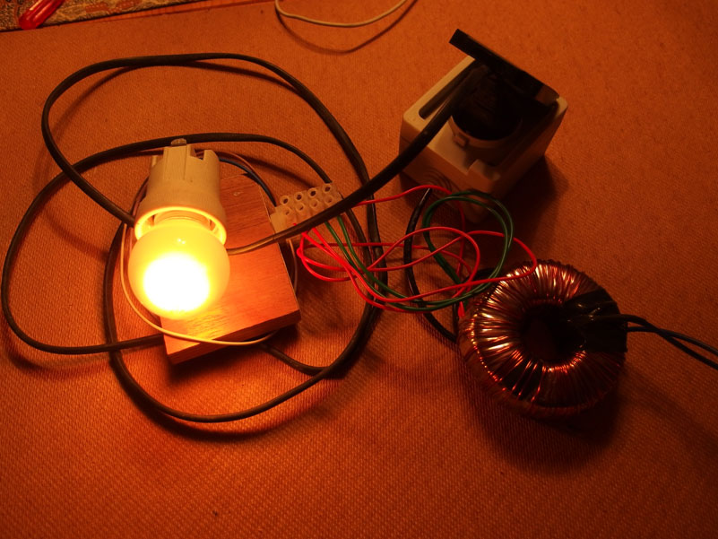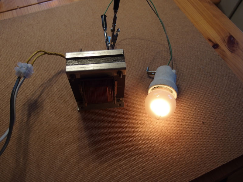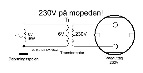 Genast funderar man... växelström i mopeden? Och med en frekvens mellan 30...270Hz, (8000rpm). Då går det att använda en transformator. Mopedens ström går här in på en 6V glödströmslindning i en vanlig gammal radiotransformator. Lampan är en 230V 15W hushållslampa, kopplad till transformatorns primärlindning, 230V, där normalt strömmen från väggutaget går in. Transformatorn arbetar baklänges. Det är alltså inga problem att driva vanliga hushållslampor från mopeden.