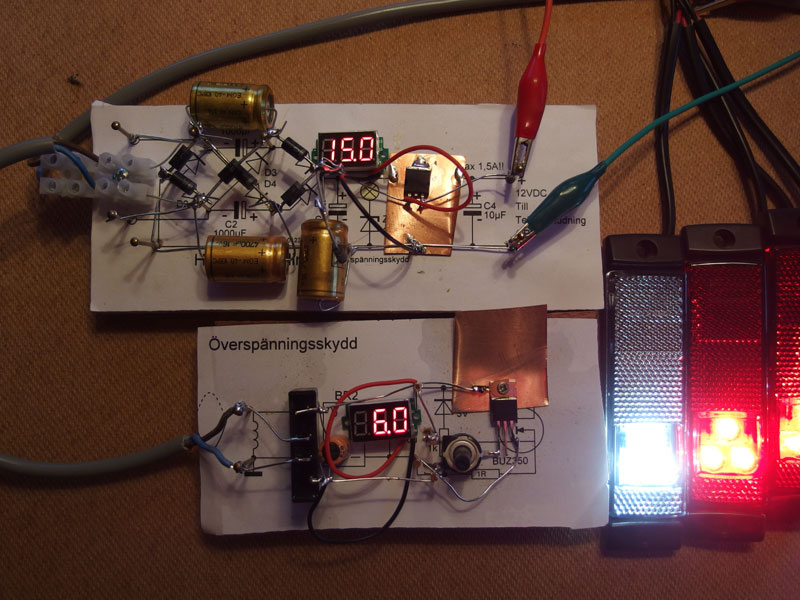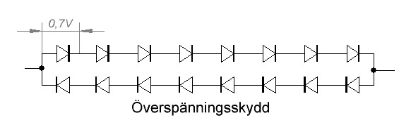 Spikade upp kopplingen för test. GPS:en startade så snällt med strömmen från mopeden och omvandlaren. Det sitter en liten voltmeter (14,4V) innan stabben, hade den för att kolla spänningen under testen. Spikkopplingar är bra! Snabbt och enkelt. Mopeden puttrar nästan på tomgång. . ÖverspänningsskyddTopparna på "sinuskurvan" från generatorn vill gärna sticka iväg långt över 30...40V om generatorspolen är obelastad. Har hittat olika versioner hur detta har tacklats. Överspänningsskydden arbetar med principen att belasta belysningspolarna om de har för hög utspänning. Och bränna upp den energin! Här är ett enkelt överspänningsskydd. När spänningen överstiger antalet dioder × 0,7V så börjar de att leda. Det behövs två rader motvända dioder för att hantera växelströmmen när den byter riktning. Dioderna blir varma och måste monteras, så att de får hjälp med kylningen. Nu är det toppspänningen som skall brännas bort, någon eller några watt.