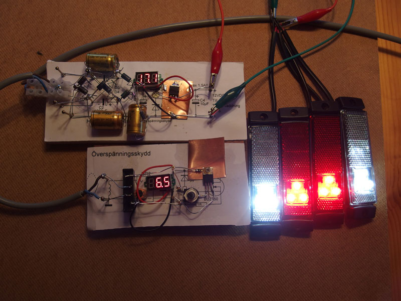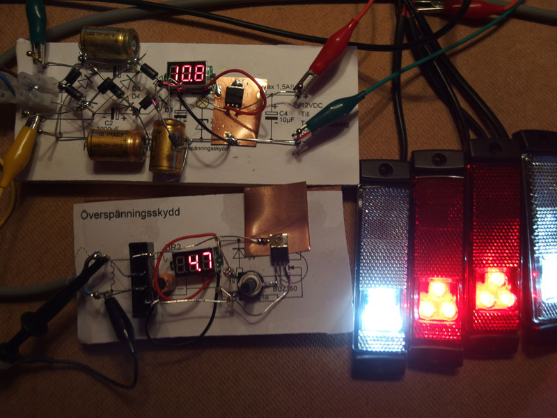 Då var det dax för bänktest av 5W spolen, den som jag skall ha till belysningen på släpvagnen. Positionsljus från Biltema. Mopeden puttrar på tomgång utanför stugan. Den undre plattan är överspänningsskyddet, mopeden lämnar nu 4,7V efter likriktningen. Överspänningsskyddet behöver inte arbeta. Den övre spikplattan visar 10,8V efter uppumpningen av befintlig spänning från 5W spolen. Det är så pass mycket att positionslysena är tända med så gott som full styrka med motorn på tomgång. De fungerar mellan 10...30V. Varje positionsljus drar ca ½W, så det blir en belastning på ca 2W med alla fyra lysena.