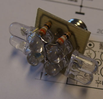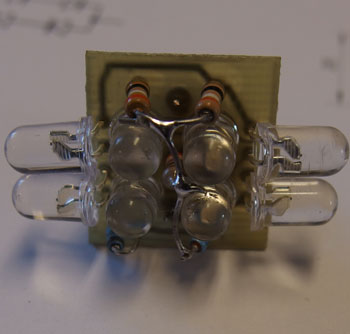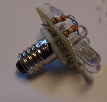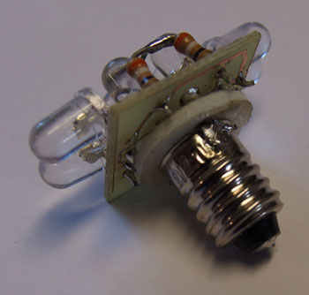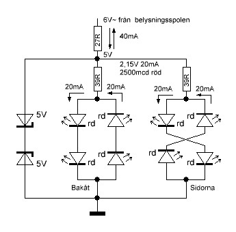 Ny LED baklampaVarför inte ersätta den med några lysdioder? Om växelströmmen skall behållas så måste det vara två motriktade rader med lysdioder. De lyser inte samtidigt, men skiftar så fort att ögat hinner inte med att se växlingarna. Zenerdioderna spänningsskyddar lysdioderna mot överspänning. Teoretiskt sjunker effekten från ordinarie lampan 3 Watt till lysdiodernas ca ¼W. Dioderna kommer från Elektrokit.