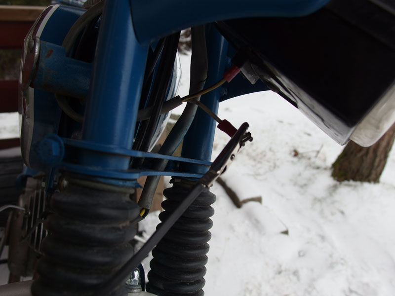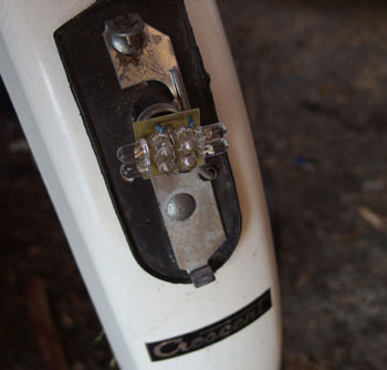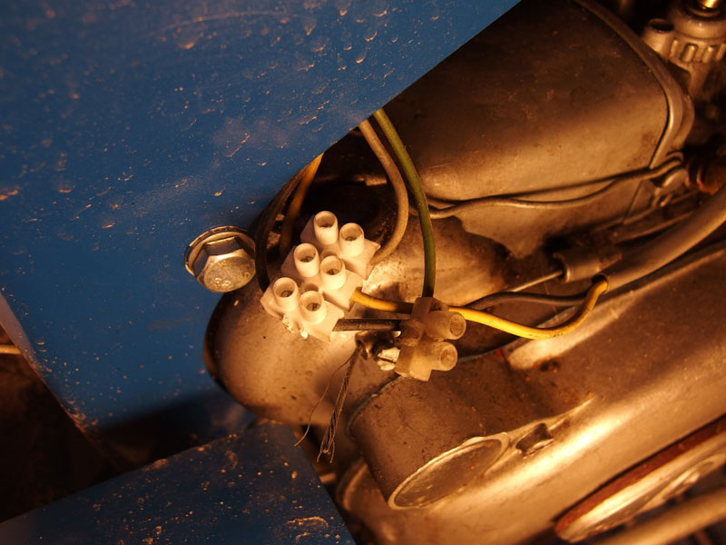 Under tiden mopeden värms upp letade jag efter kopplingsplinten från motorn. Oj, det var bara tre trådar, borde vara fyra. Efter lite mer grävande så hittade jag den felande gröna tråden, den som inte användes i denna mopedmodell. Den för bromslyset. Satt på en egen kopplingsplint. Nu är det att skarva från den gula och gröna tråden upp till var sitt uttag under sadeln. Man litar på att den "andra" tråden går i chassit. Det gäller att alla bultförband är dragna.