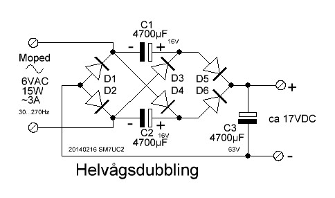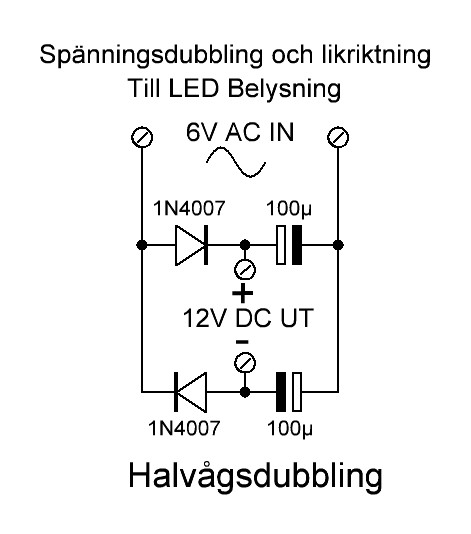 Detta är en enkel metod att dubblera 6 Volt växelström och få ut 12 Volt likström, men den använder endast halva sinuskurvan. Det begränsar effektuttaget. Men för något positionsljus är det tillräckligt. . Helvågsdubbling