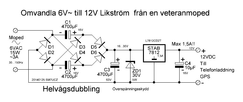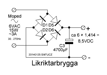 Här i mopeden skulle en obelastad belysningsspole höja spänningen drastiskt, och slå sönder reglerstabben, om det inte satt en 30V zenerdiod som begränsar toppspänningen. Utspänningen är naturligtvis beroende av varvtalet på motorn. Här skulle det passa att ladda ett litet batteri som buffert. Då får utspänningen från stabben höjas till 14,4V, som är laddspänning till ett blybatteri. Det går inte att koppla minussidan av 12V till mopedens chassi!! Vill man det... så måste en transformator 6/6V sättas på ingången som potentialskiljer spänningarna. Dioderna är 1N5404, klarar 3A och flera hundra volt.