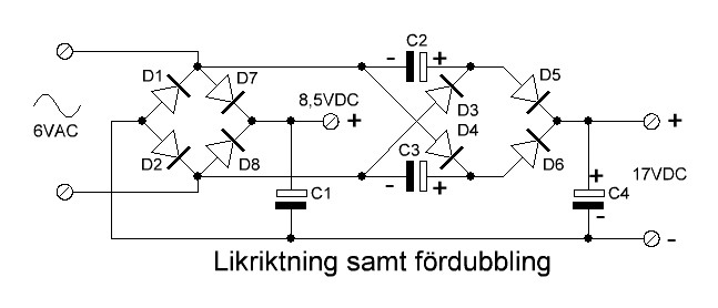 Denna geniala koppling helvågsdubblerar en 6V växelström till drygt 12V likström utan transformator, den bör oxo testas. Kopplingen dubblerar spänningen oberoende vilken växelspänning den matas med. Har använt den att dubblera 200V~ till 600DCV. Komponenterna måste väljas därefter, så att de tål spänningen. Det är dioderna D3 och D4 tillsammans med kondensatorerna C1 och C2 som gör jobbet med dubbleringen. Om D3, D4, C1 och C2 utesluts, så blir det en normal likriktarbrygga. Fundera inatt innan du somnar ...på hur det funkar!! Men funkar gör det!