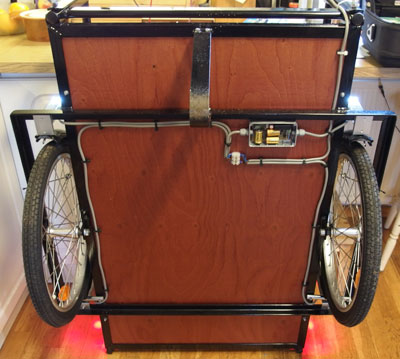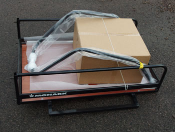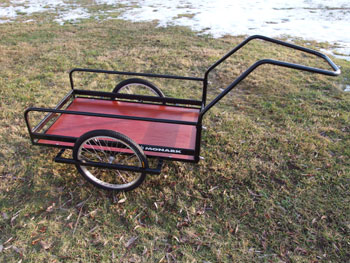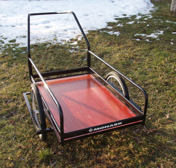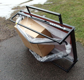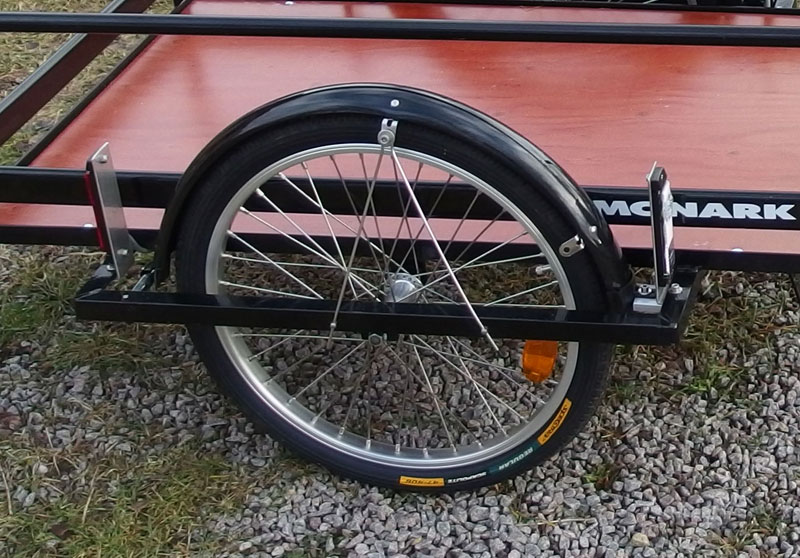 Jag fick ytterligare en cykelkärra av en kompis. Efter att ha ställt upp de båda kärrorna mot väggen och satt hjulen i spinning så dömde jag ut dem, och de fick körförbud. I alla fall efter en moped. Det knastrade och morrade i hjullagren. Beställde en ny kärra som kom i ett paket. Den är inte den lättaste på marknaden, men den är typad för 200 kg last. Min tanke är att använda LED-belysning på släpkärran driven från 5W spolen. Pumpa upp 6V till 12V via den transformatorlösa omformaren beskriven ovan. Biltemas positionsljus med reflexer tar ca ½W styck. Två vita fram och två röda bak blir 2W. Och eftersom släpet klassas som cykelkärra, får det bli gula reflexer i ekrarna på hjulen. Inte för att det kommer att bli så mycket mörkerkörning. Men det ser bättre ut om Harry Haffa är ute.