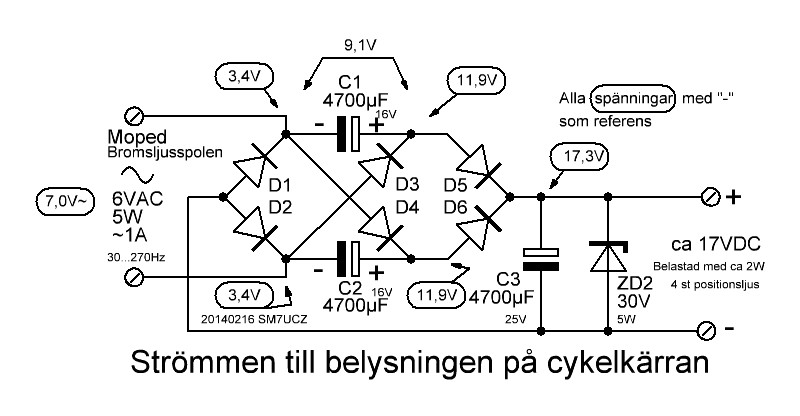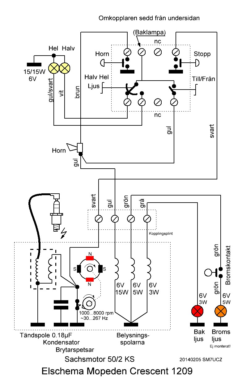 Skjutsande3 § På en cykel eller en moped får inte samtidigt färdas flera personer än cykeln eller mopeden är byggd för. När en cykel eller moped klass II har lämpliga säten och effektivt skydd mot hjulekrarna får dock på fordonet färdas ytterligare Om du tänker utifrån en vanlig cykel är väl reglerna lättare att förstå: Cykeln är byggd för en person. Utöver denna person är det tillåtet att ta med ett barn som inte fyllt 10 år om cykelföraren fyllt 15 år alternativt två barn som inte fyllt 6 år om cykelföraren fyllt 18 år. Man kan alltså färdas upp till 3 personer på cykeln som är byggd för en person under förutsättning att det finns lämpliga säten och effektivt skydd mot hjulekrarna. ---- ElsystemetKopplingsschemaRitade upp elschemat, som jag tror att det är. Nu saknas bromslyse, men generatorspolen finns där ändå. Allt är växelström. Det är tre belysningsspolar, och varför det? Obelastade spolar ger en betydlig för hög överspänning, vilket skulle knäcka de små lamporna på bakskärmen om inte framlycktan är tänd. Spolen 3W till baklampan ligger inte i magnetfältet, utan blir påverkad av 15W spolen. En finurlig egenskap. Strömmen är avsett att enbart ha några lampor tända, därför duger detta enkla batterilösa elsystem. Men, nu är det 6V växelström. Det duger inte till modern elektronik, som telefoner eller GPS osv. De suttar hellre på 12 volt's diet. Växelström är lätt att konvertera till olika spänningar, likrikta och stabilicera, häng med här... Utan att göra åverkan på veteranmopeden.