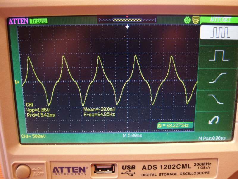 Med ett oscilloskop konstateras att kurvformen inte följer sinuslagen. Det är en smal kurva och hög top-top spänning. Här 18,6V t-t på drygt tomgång. (10ggr dämpning i proben) och med en liten lampa som belastning. Frekvensen, ca 65Hz, omräknat blir det ca 1950 rpm på motorn. . 230V från mopeden!